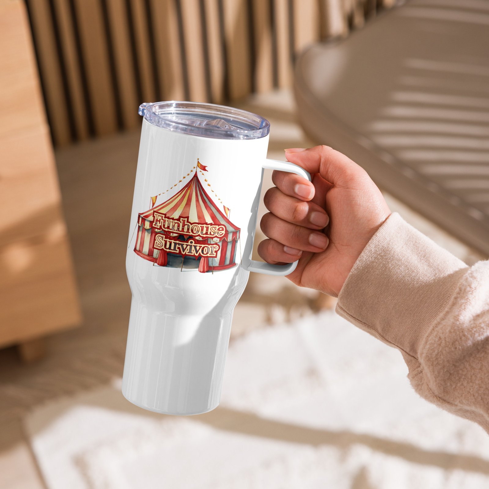 The Funhouse Survivor Travel Mug is for the ones who keep showing up. Not because it’s easy, but because they’re steady, capable, and not done yet.